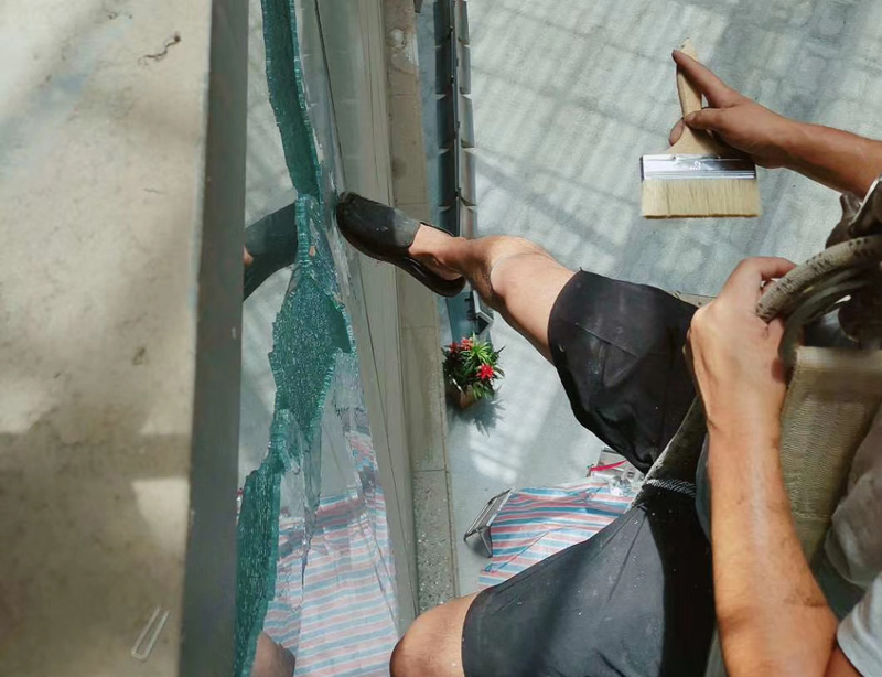 第三步:玻璃運(yùn)到施工現(xiàn)場(chǎng)后,工人現(xiàn)場(chǎng)乘坐吊籃現(xiàn)場(chǎng)安裝施工。最后施工完成。